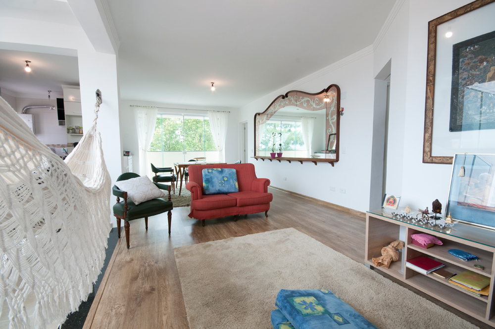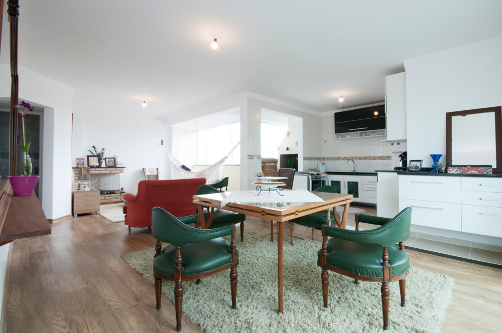Sala com 2 ambientes e cozinha integrada, varanda com churrasqueira, vista para